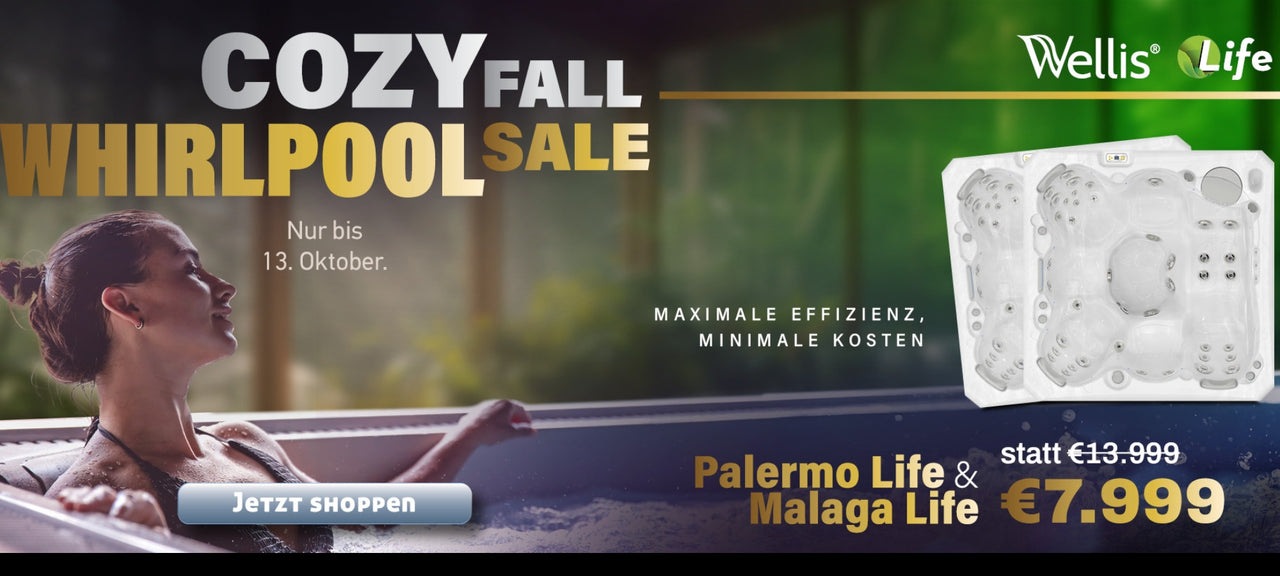 Erfüllen Sie sich den Traum vom eigenen Outdoor Whirlpool und holen Sie sich jetzt den Palermo zur Herbstaktion mit 50 % Rabatt, von Europas größtem Hersteller Wellis!